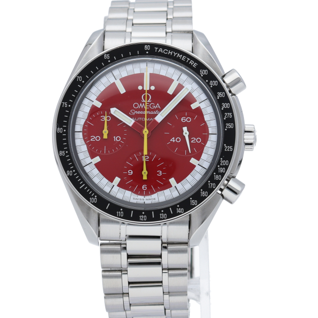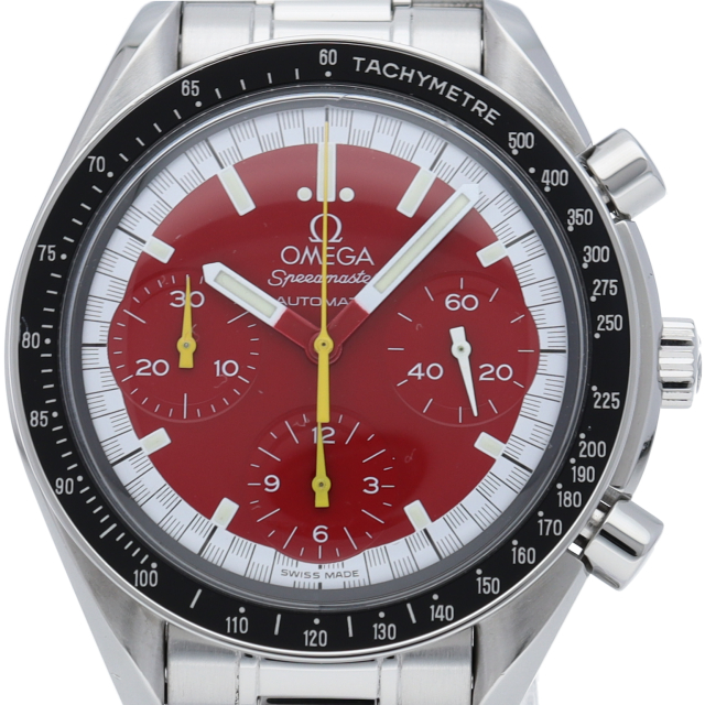 数々のF1チャンピオンに輝いたシューマッハとオメガのコラボレーション「スピードマスター」。シンプルな中にもひときわ目立つ文字盤の配色がオシャレな1本。