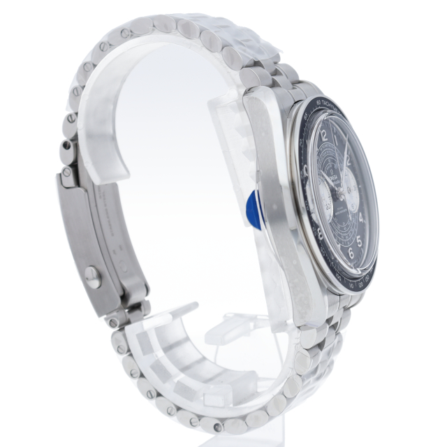 「スピードマスター」の伝説的なデザインと、1940年代から続くオメガのクロノグラフ ウォッチの歴史から得たインスピレーションを融合した、「クロノスコープ」コレクション。9時位置にスモールセコンドカウンター、3時位置にシルバー60分および12時間積算計を備え、ステンレススティール製のブレスレットが合わせられています。オメガ コーアクシャル マスター クロノメーター キャリバー9908搭載。