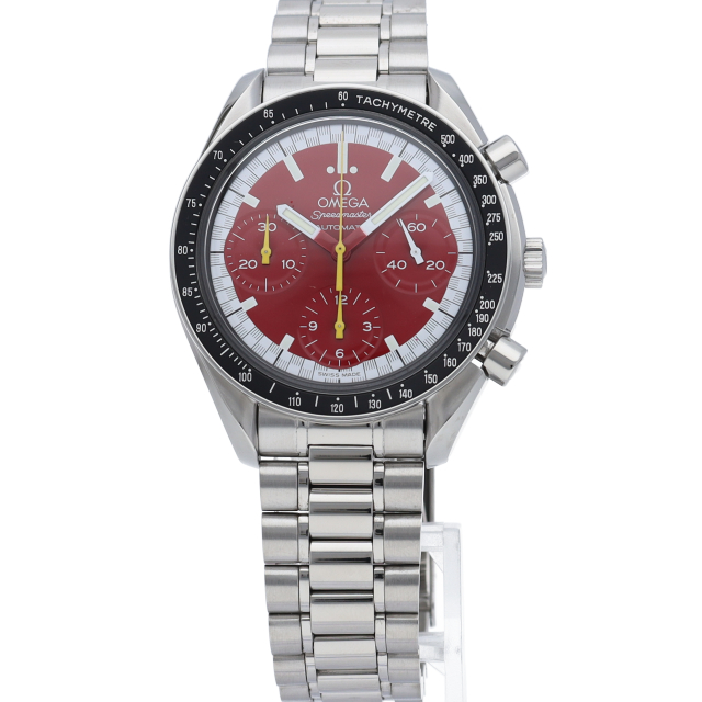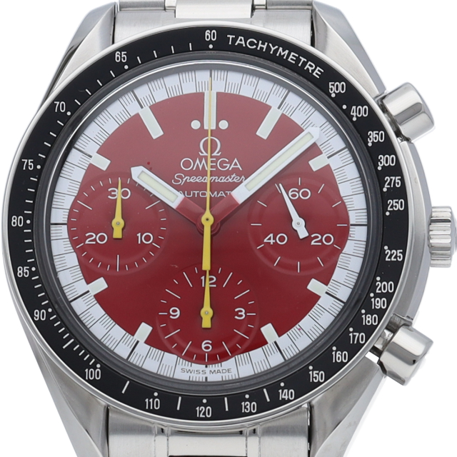 数々のF1チャンピオンに輝いたシューマッハとオメガのコラボレーション「スピードマスター」。シンプルな中にもひときわ目立つ文字盤の配色がオシャレな1本。