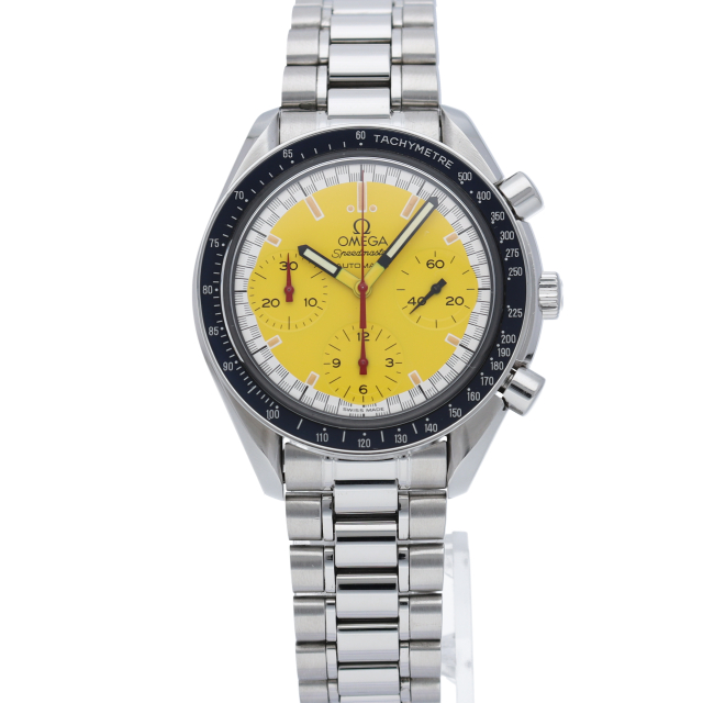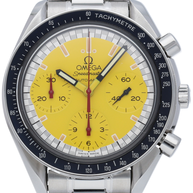 オメガでファンであったF1ドライバー、ミハエル・シューマッハと広告契約を結んだことを記念して製作されたモデル。文字盤の外周部はチェッカーフラッグをイメージしたデザインになっています。