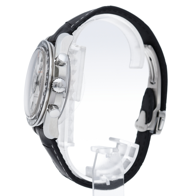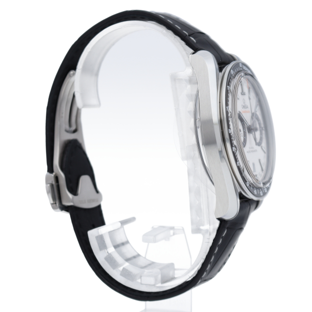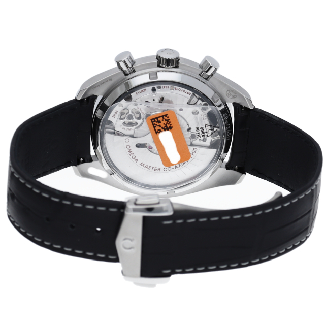 「スピードマスター レーシング マスター クロノメーター」のステンレススティール製の44.25mmケースには、ホワイトエナメル加工によるタキメータースケールを備えたブラックセラミック製ベゼルリングがセットされています。ストラップはブラックのレザー製です。METAS認定の最高水準を誇るオメガ コーアクシャル マスター クロノメーター9900搭載。