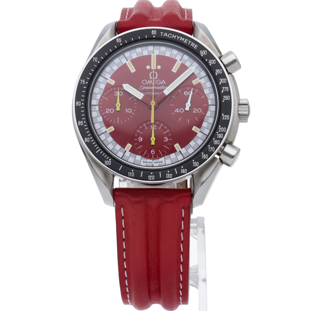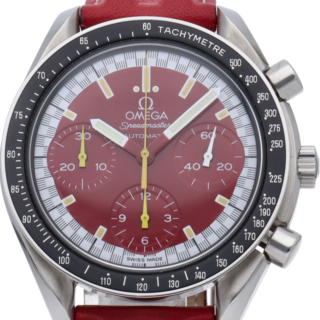 数々のF1チャンピオンに輝いたシューマッハとオメガのコラボレーション「スピードマスター」。シンプルな中にもひときわ目立つ文字盤の配色がオシャレな1本。