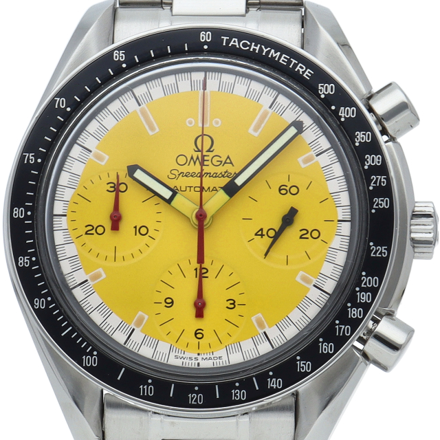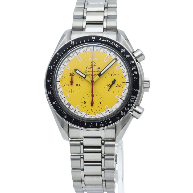 オメガでファンであったF1ドライバー、ミハエル・シューマッハと広告契約を結んだことを記念して製作されたモデル。文字盤の外周部はチェッカーフラッグをイメージしたデザインになっています。