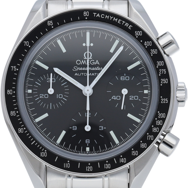 オメガを代表する人気シリーズ「スピードマスター」。プラ風防からサファイアクリスタル風防へ仕様変更された実用性の高いモデルです。すでに生産終了となり、これからの相場が楽しみな1本です。