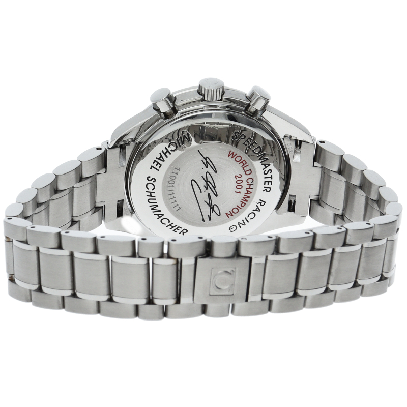 モータースポーツをイメージして設計された「スピードマスター レーシング」。伝説のドライバー、ミハエル・シューマッハが2001年ワールドチャンピオンになったのを記念に作られた世界限定11111本限定モデル。インデックスの1の数字と限定本数11111本という、「NO.1」にこだわり抜いた貴重な1本。