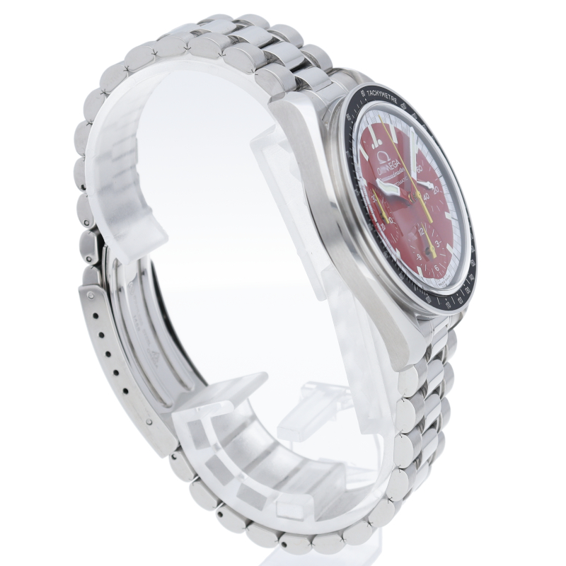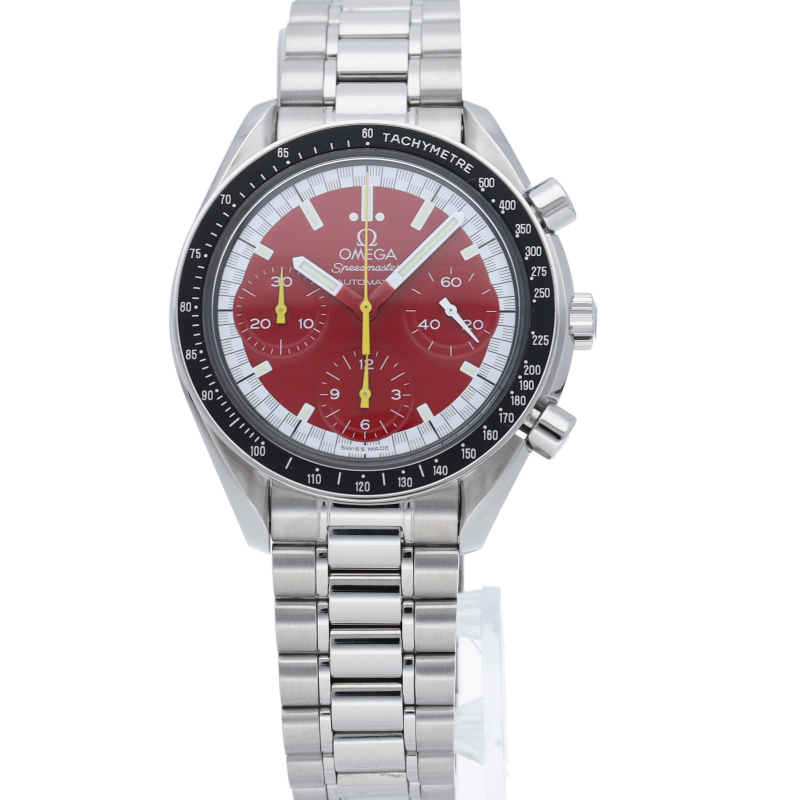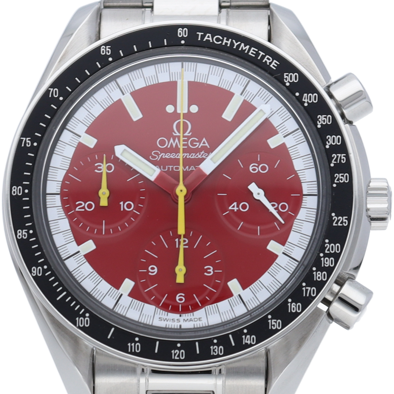 数々のF1チャンピオンに輝いたシューマッハとオメガのコラボレーション「スピードマスター」。シンプルな中にもひときわ目立つ文字盤の配色がオシャレな1本。