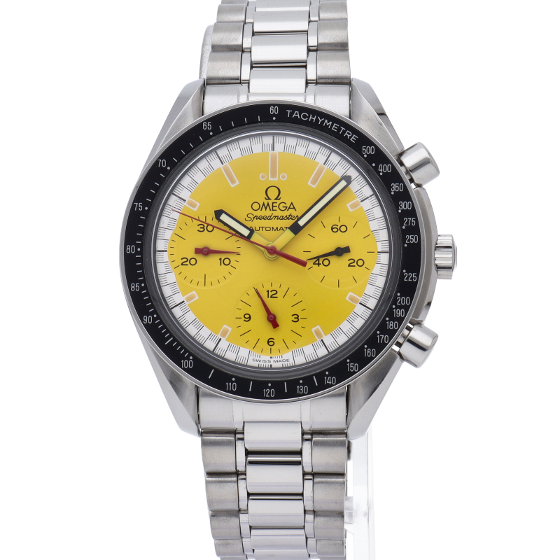 オメガでファンであったF1ドライバー、ミハエル・シューマッハと広告契約を結んだことを記念して製作されたモデル。文字盤の外周部はチェッカーフラッグをイメージしたデザインになっています。