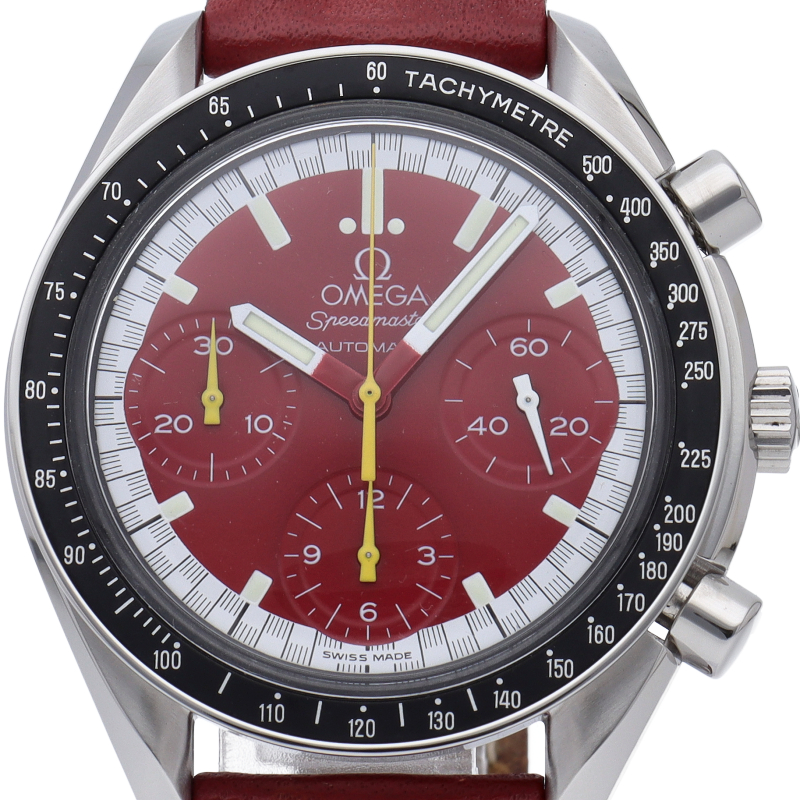 数々のF1チャンピオンに輝いたシューマッハとオメガのコラボレーション「スピードマスター」。シンプルな中にもひときわ目立つ文字盤の配色がオシャレな1本。