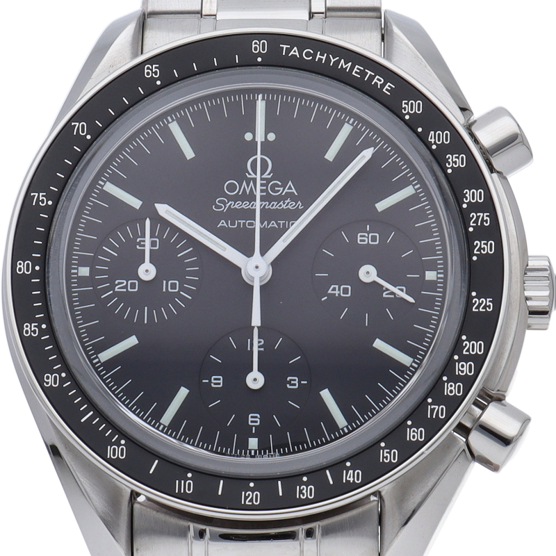 オメガを代表する人気シリーズ「スピードマスター」。プラ風防からサファイアクリスタル風防へ仕様変更された実用性の高いモデルです。すでに生産終了となり、これからの相場が楽しみな1本です。