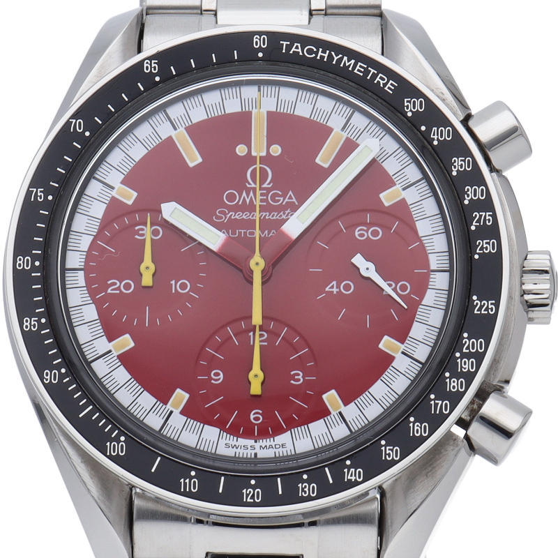 数々のF1チャンピオンに輝いたシューマッハとオメガのコラボレーション「スピードマスター」。シンプルな中にもひときわ目立つ文字盤の配色がオシャレな1本。