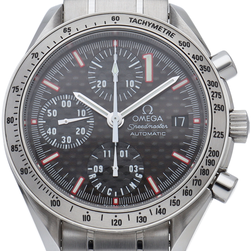 モータースポーツをイメージして設計された「スピードマスター レーシング」。伝説のドライバー、ミハエル・シューマッハが2001年ワールドチャンピオンになったのを記念に作られた世界限定11111本限定モデル。インデックスの1の数字と限定本数11111本という、「NO.1」にこだわり抜いた貴重な1本。