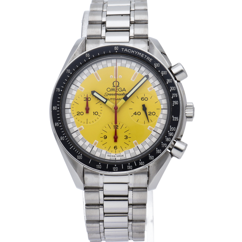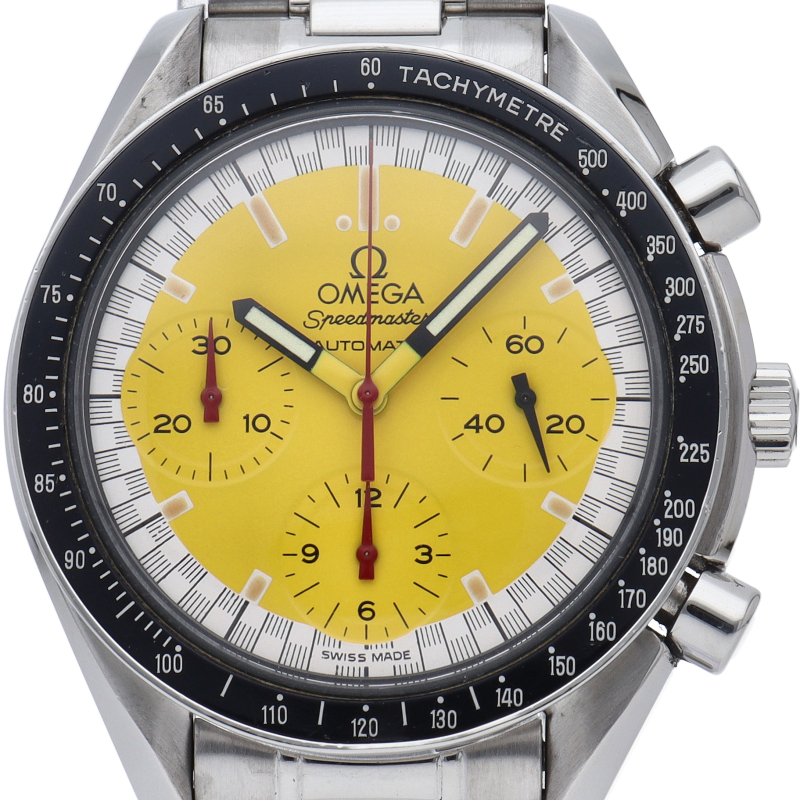 オメガでファンであったF1ドライバー、ミハエル・シューマッハと広告契約を結んだことを記念して製作されたモデル。文字盤の外周部はチェッカーフラッグをイメージしたデザインになっています。