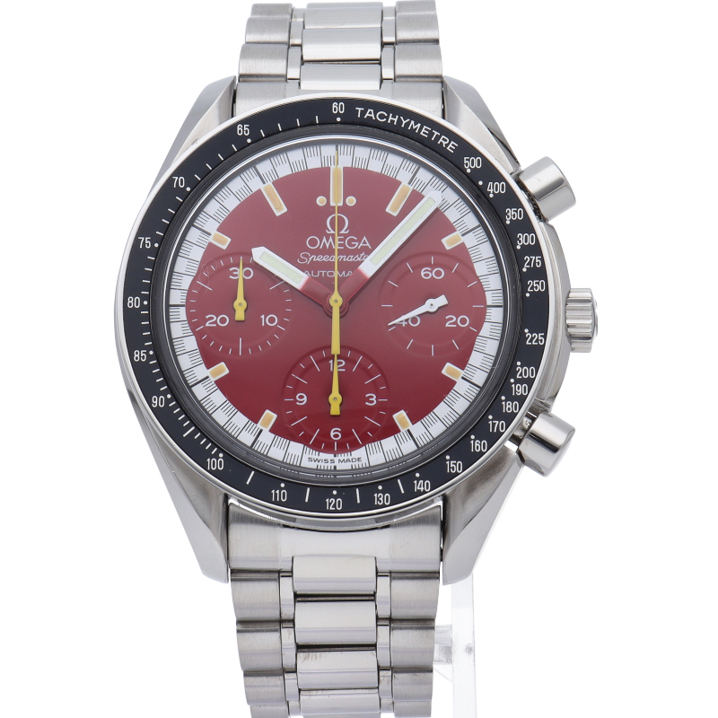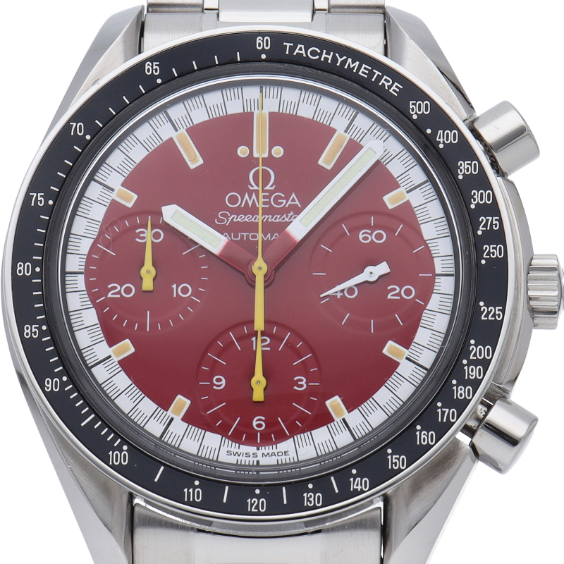 数々のF1チャンピオンに輝いたシューマッハとオメガのコラボレーション「スピードマスター」。シンプルな中にもひときわ目立つ文字盤の配色がオシャレな1本。