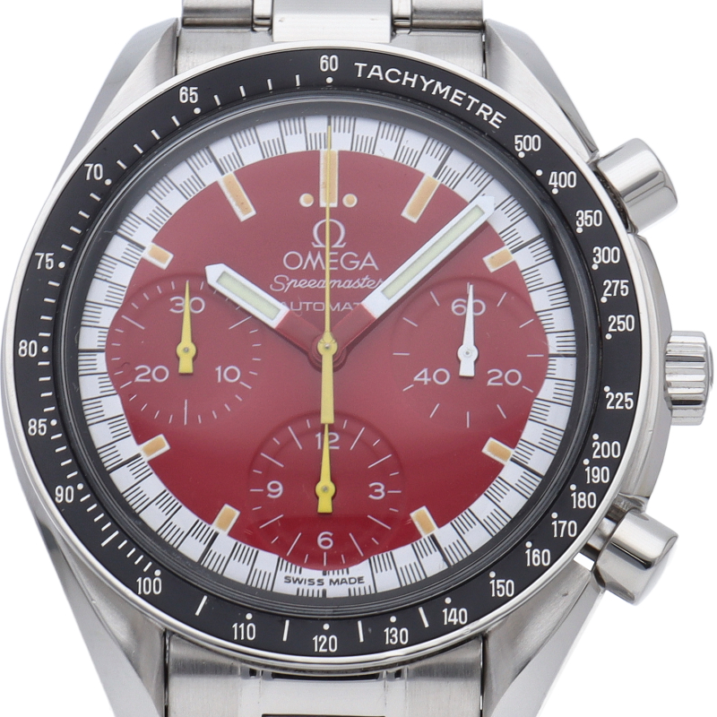 数々のF1チャンピオンに輝いたシューマッハとオメガのコラボレーション「スピードマスター」。シンプルな中にもひときわ目立つ文字盤の配色がオシャレな1本。