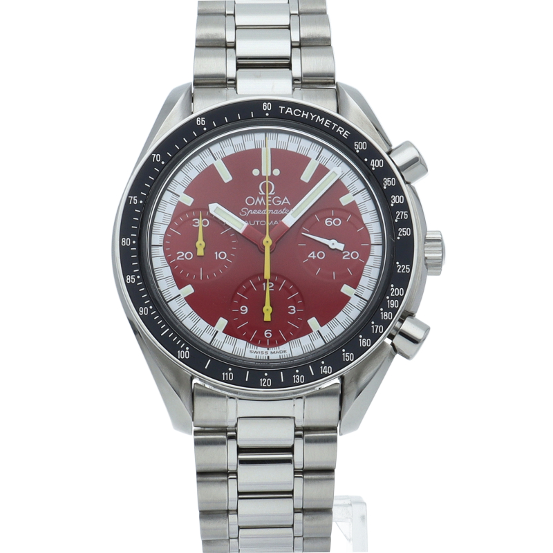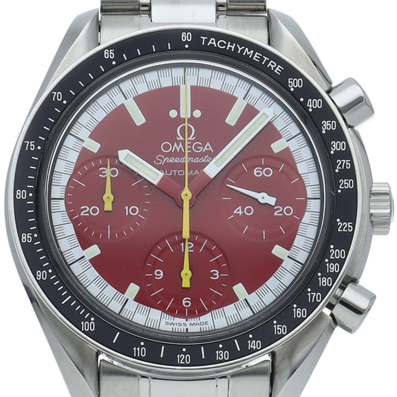 数々のF1チャンピオンに輝いたシューマッハとオメガのコラボレーション「スピードマスター」。シンプルな中にもひときわ目立つ文字盤の配色がオシャレな1本。