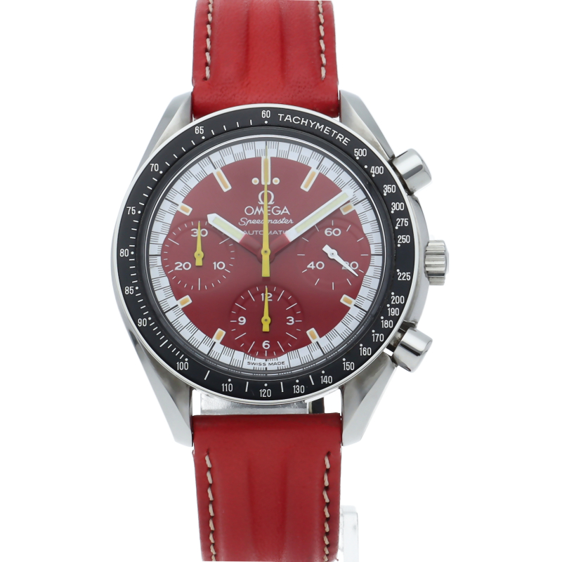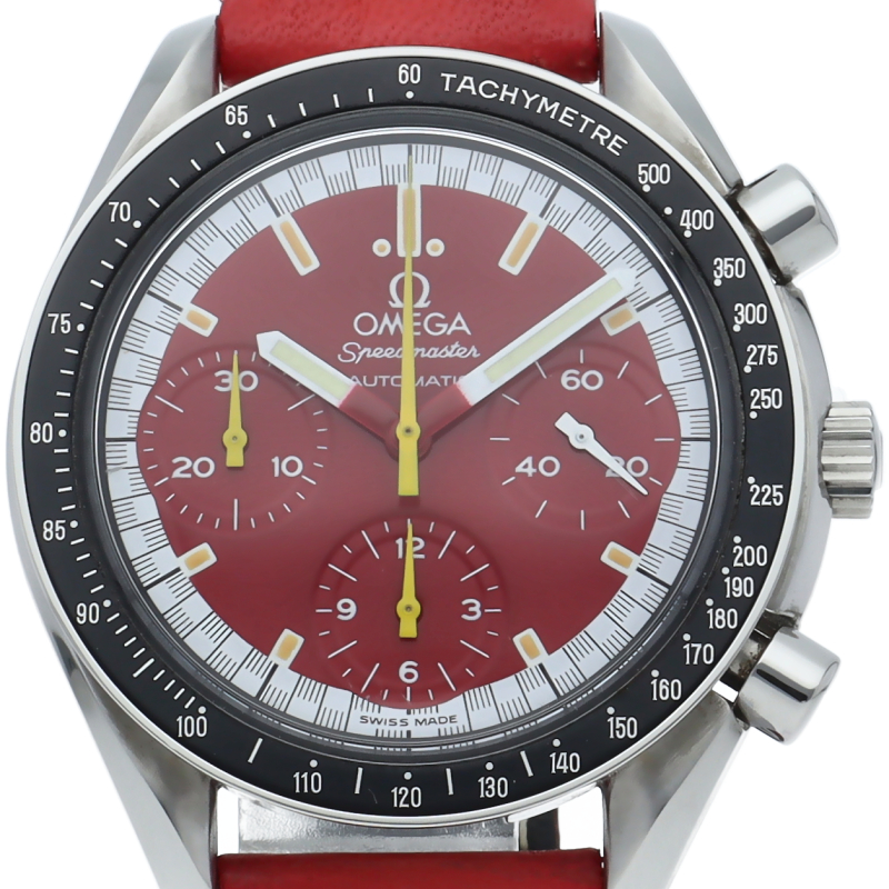 数々のF1チャンピオンに輝いたシューマッハとオメガのコラボレーション「スピードマスター」。シンプルな中にもひときわ目立つ文字盤の配色がオシャレな1本。
