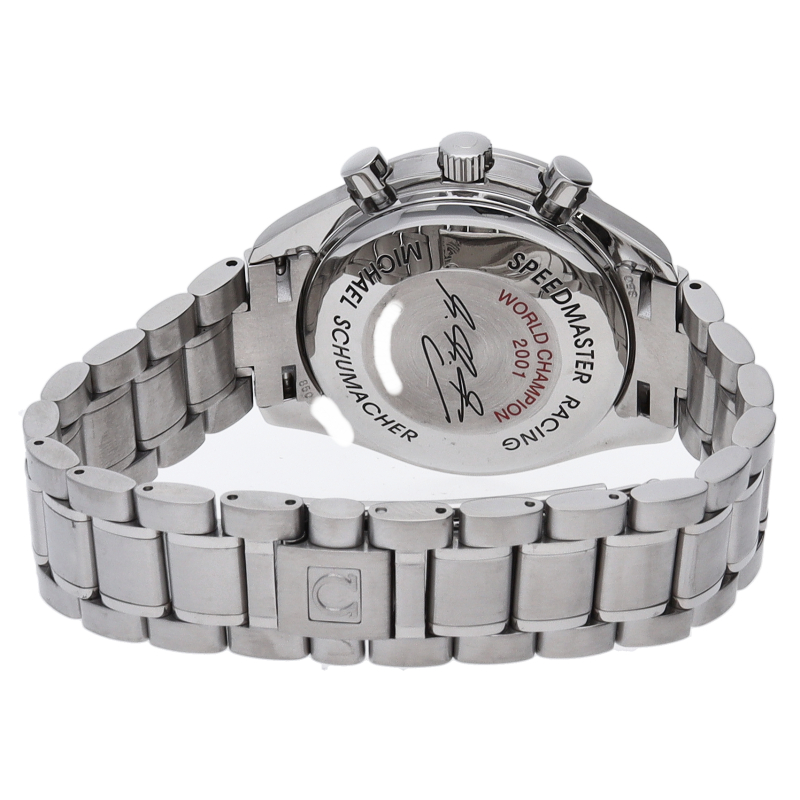 モータースポーツをイメージして設計された「スピードマスター レーシング」。伝説のドライバー、ミハエル・シューマッハが2001年ワールドチャンピオンになったのを記念に作られた世界限定11111本限定モデル。インデックスの1の数字と限定本数11111本という、「NO.1」にこだわり抜いた貴重な1本。