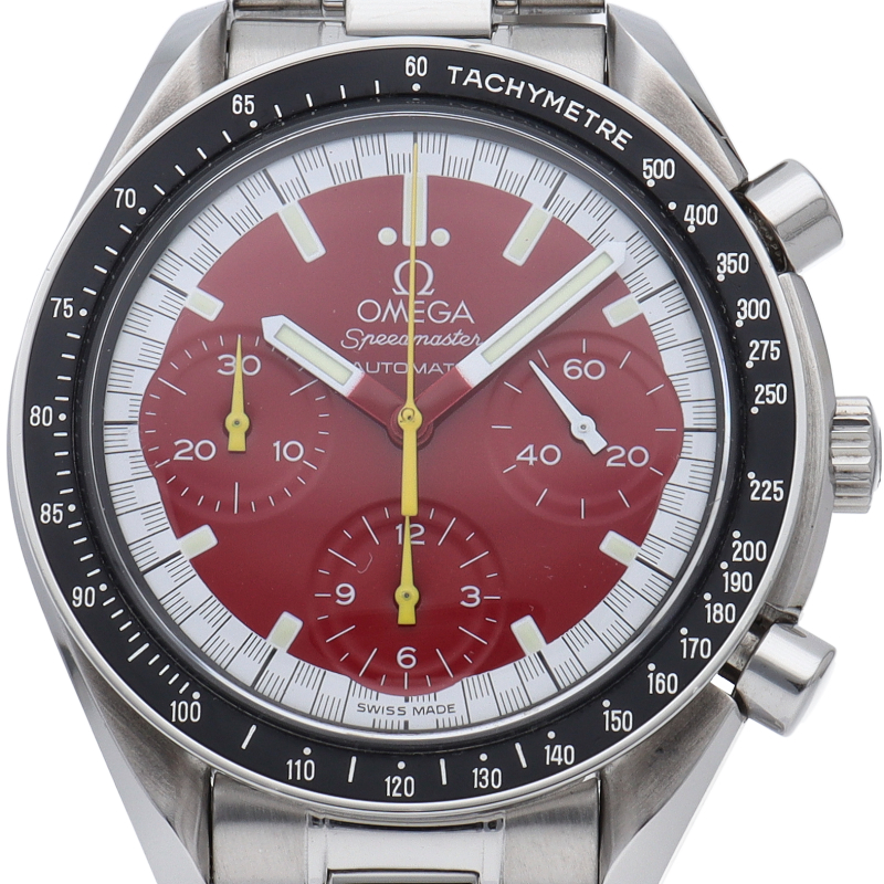 数々のF1チャンピオンに輝いたシューマッハとオメガのコラボレーション「スピードマスター」。シンプルな中にもひときわ目立つ文字盤の配色がオシャレな1本。