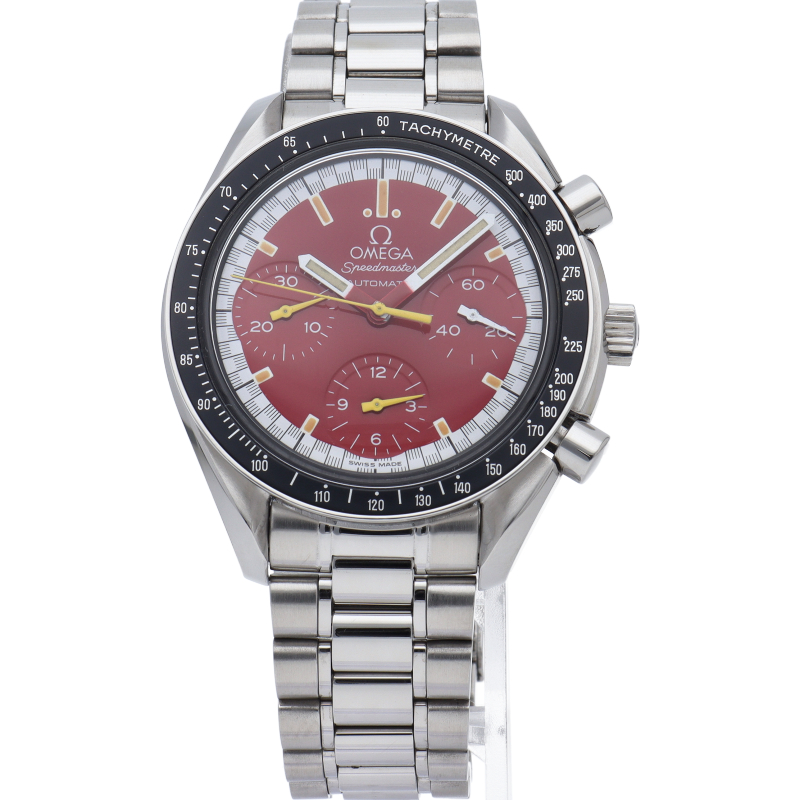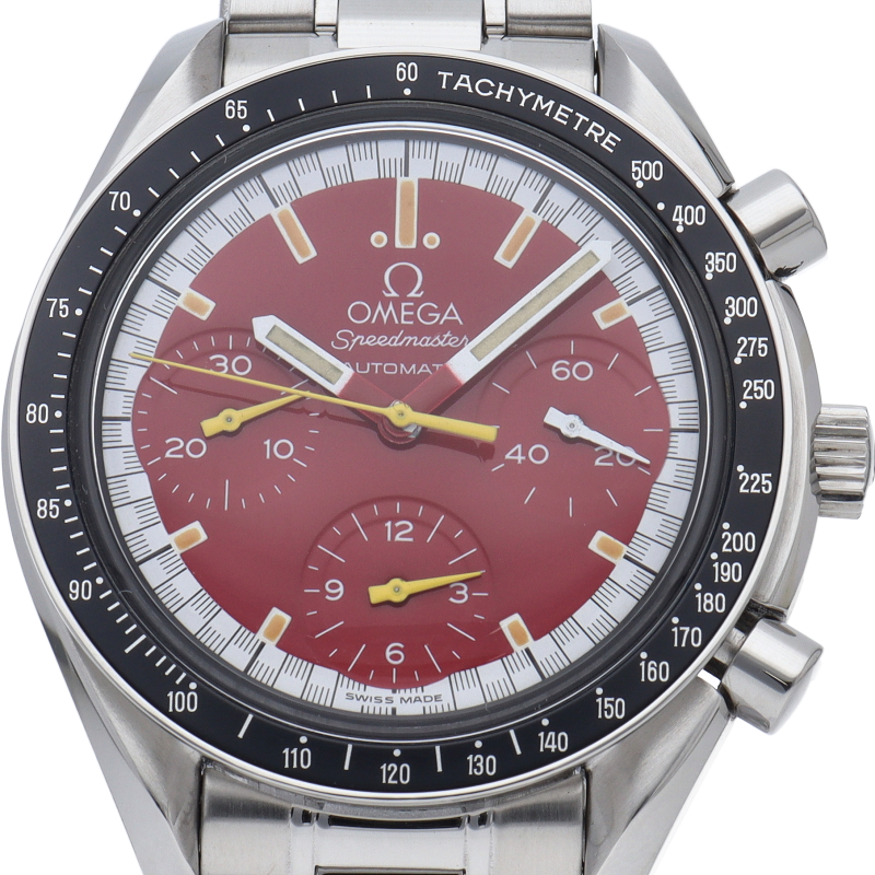 数々のF1チャンピオンに輝いたシューマッハとオメガのコラボレーション「スピードマスター」。シンプルな中にもひときわ目立つ文字盤の配色がオシャレな1本。