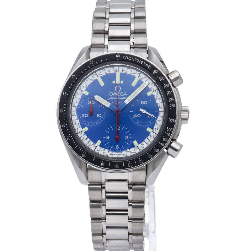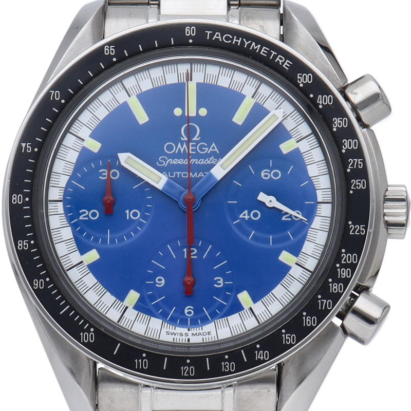 数々のF1チャンピオンに輝いたシューマッハとオメガのコラボレーション「スピードマスター」。シンプルな中にもひときわ目立つ文字盤の配色がオシャレな1本。