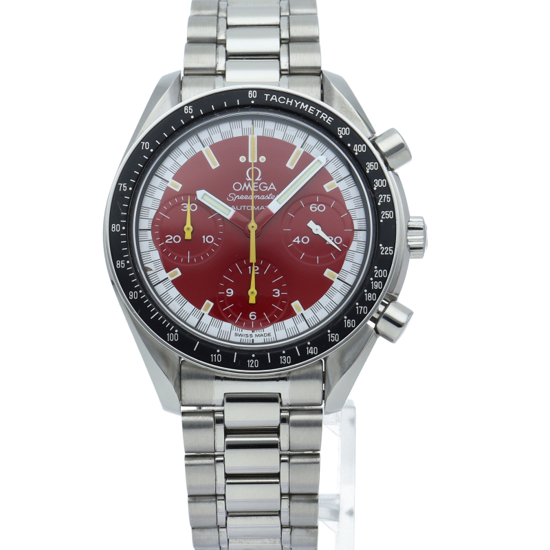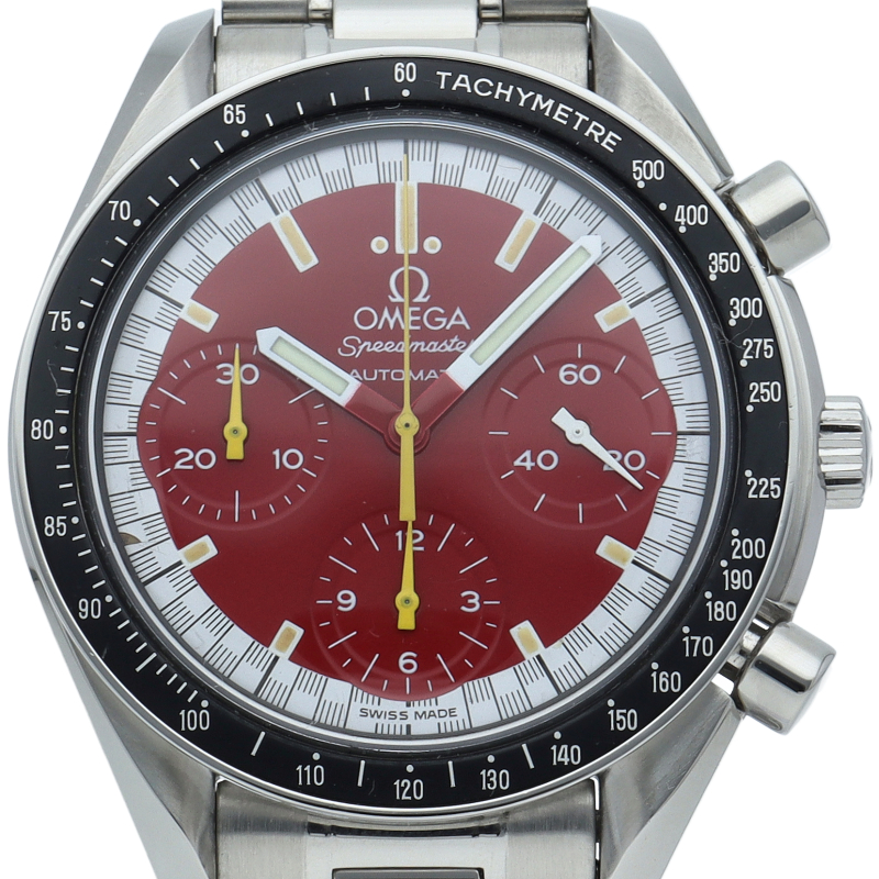 数々のF1チャンピオンに輝いたシューマッハとオメガのコラボレーション「スピードマスター」。シンプルな中にもひときわ目立つ文字盤の配色がオシャレな1本。