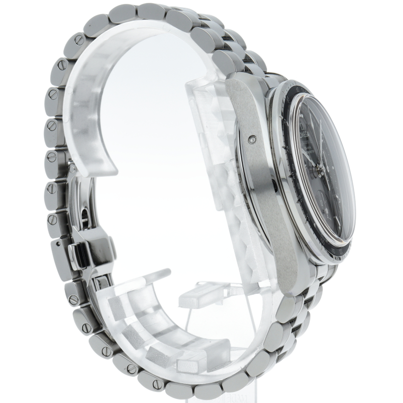 このモデルの特徴は、ステンレススティール製ケースと、ブラックのアルミニウム製リングにタキメータースケールを搭載したベゼルです。サンブラッシュ仕上げのグレーのダイアルには横楕円型のサブダイアルを、6時位置には縦楕円型の日付窓を配しました。針とインデックスはロジウム仕上げです。オメガ コーアクシャル キャリバー3330搭載。