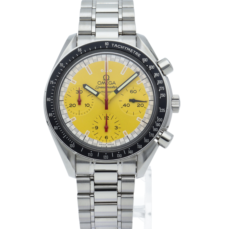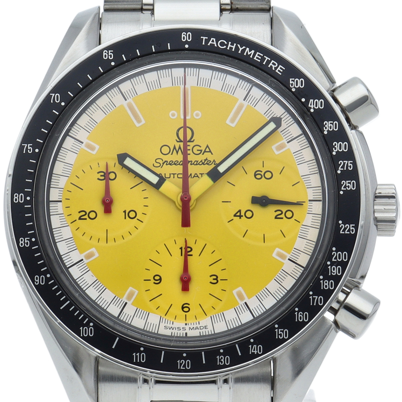 オメガでファンであったF1ドライバー、ミハエル・シューマッハと広告契約を結んだことを記念して製作されたモデル。文字盤の外周部はチェッカーフラッグをイメージしたデザインになっています。