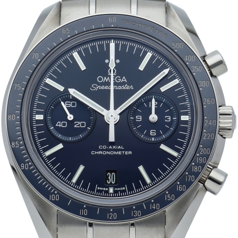 オメガを代表する人気シリーズ「スピードマスター」。このモデルは、ラッカー仕上げのブルーのダイアルに、9時位置のスモールセコンドダイアル、3時位置に同軸に設定された12時間積算計および60分積算計が特徴です。コーアクシャル キャリバー9300は、オメガが自社開発した機械式クロノグラフムーブメントです。