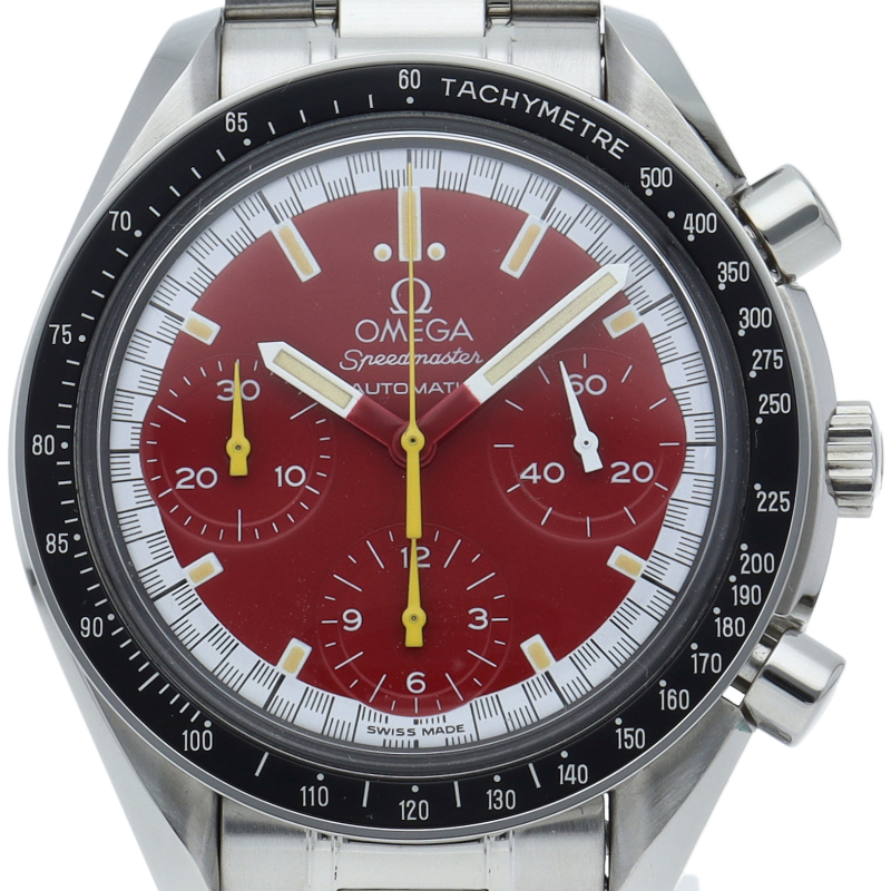 数々のF1チャンピオンに輝いたシューマッハとオメガのコラボレーション「スピードマスター」。シンプルな中にもひときわ目立つ文字盤の配色がオシャレな1本。