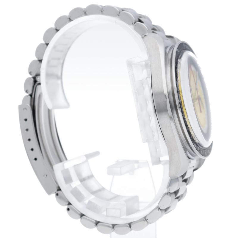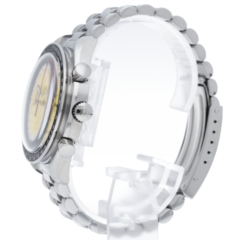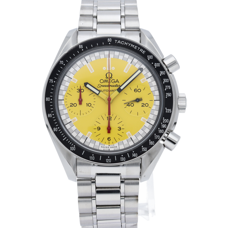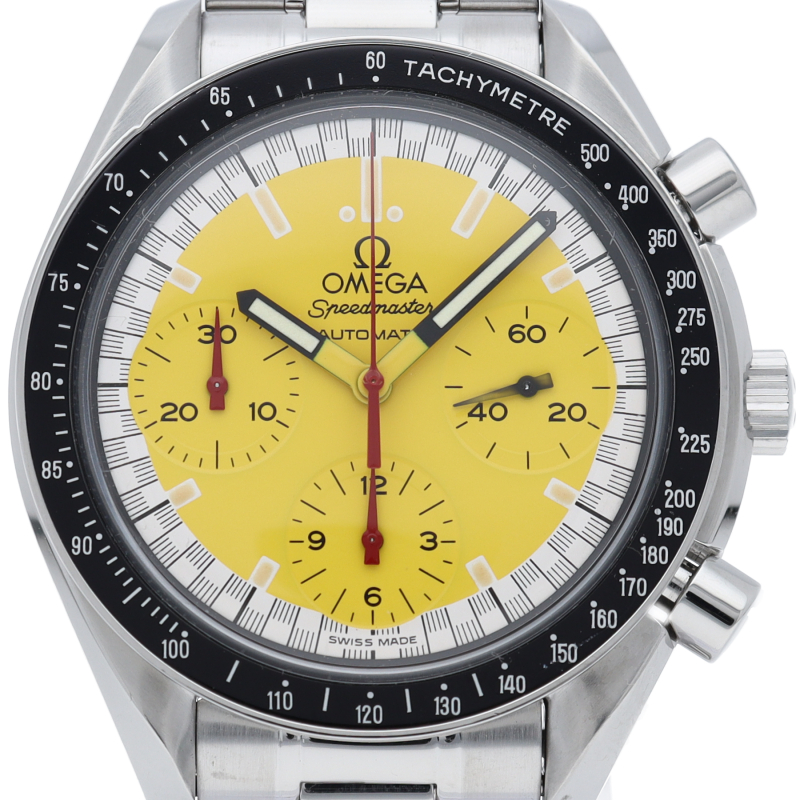 オメガでファンであったF1ドライバー、ミハエル・シューマッハと広告契約を結んだことを記念して製作されたモデル。文字盤の外周部はチェッカーフラッグをイメージしたデザインになっています。