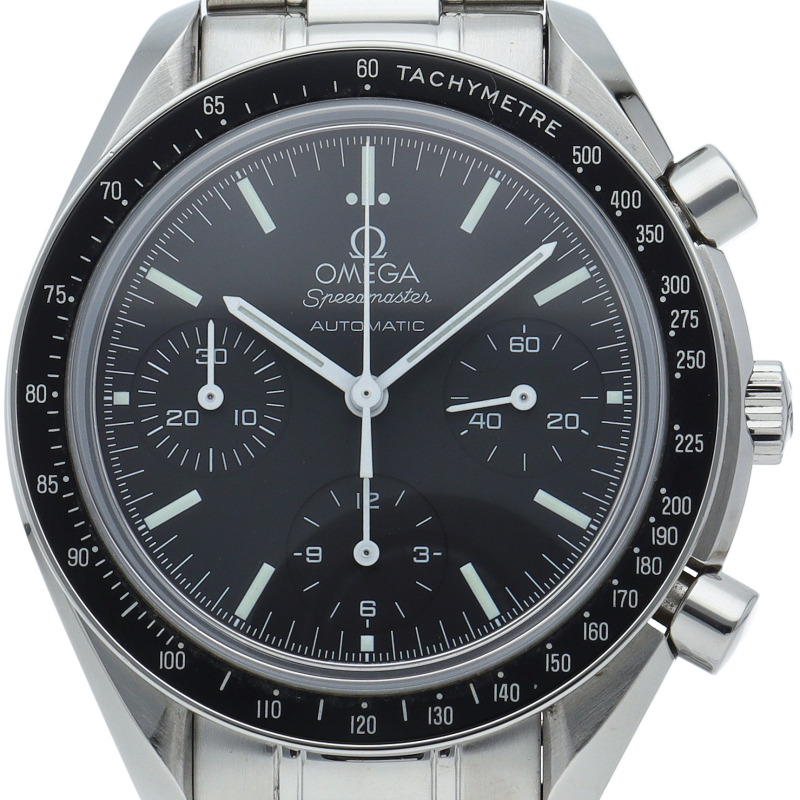 オメガを代表する人気シリーズ「スピードマスター」。プラ風防からサファイアクリスタル風防へ仕様変更された実用性の高いモデルです。すでに生産終了となり、これからの相場が楽しみな1本です。