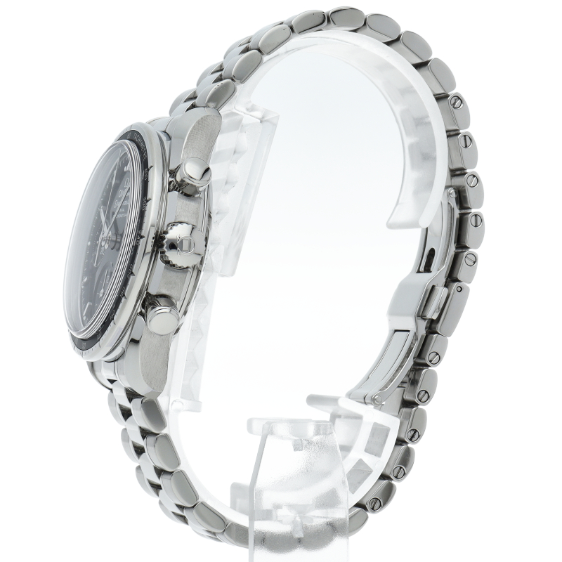 このモデルの特徴は、ステンレススティール製ケースと、ブラックのアルミニウム製リングにタキメータースケールを搭載したベゼルです。サンブラッシュ仕上げのグレーのダイアルには横楕円型のサブダイアルを、6時位置には縦楕円型の日付窓を配しました。針とインデックスはロジウム仕上げです。オメガ コーアクシャル キャリバー3330搭載。