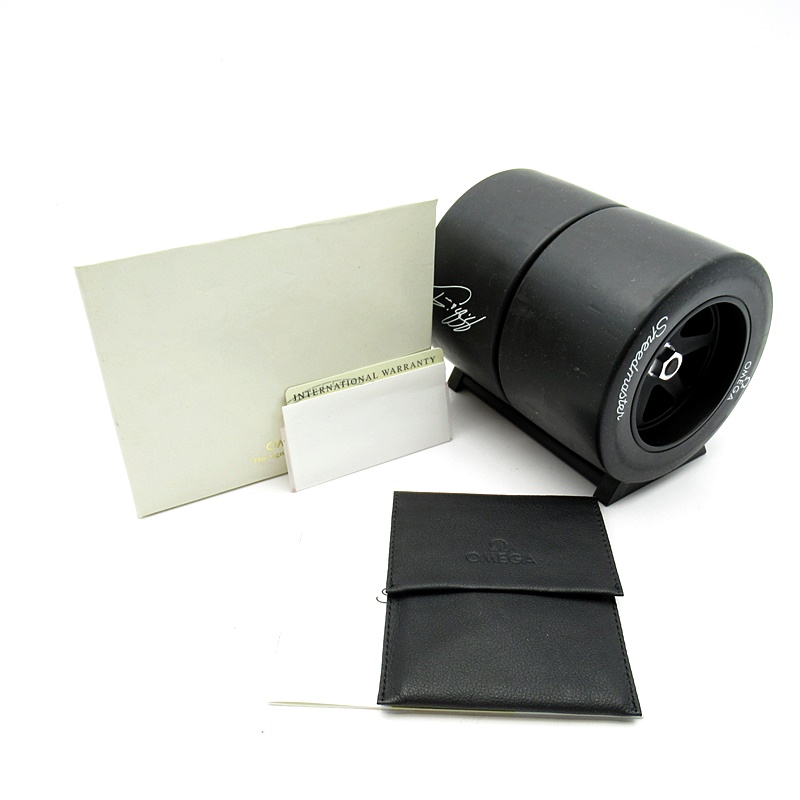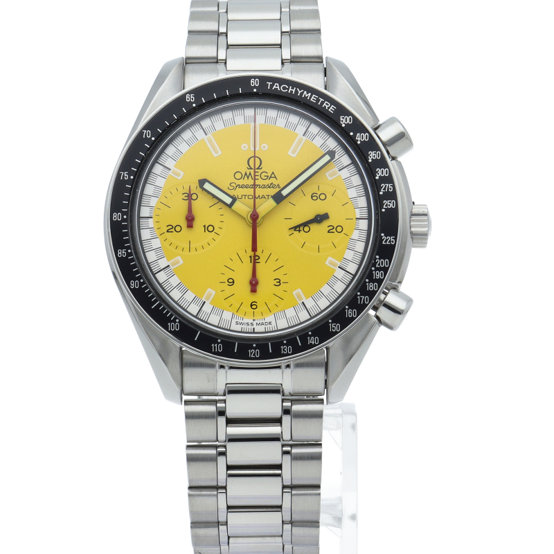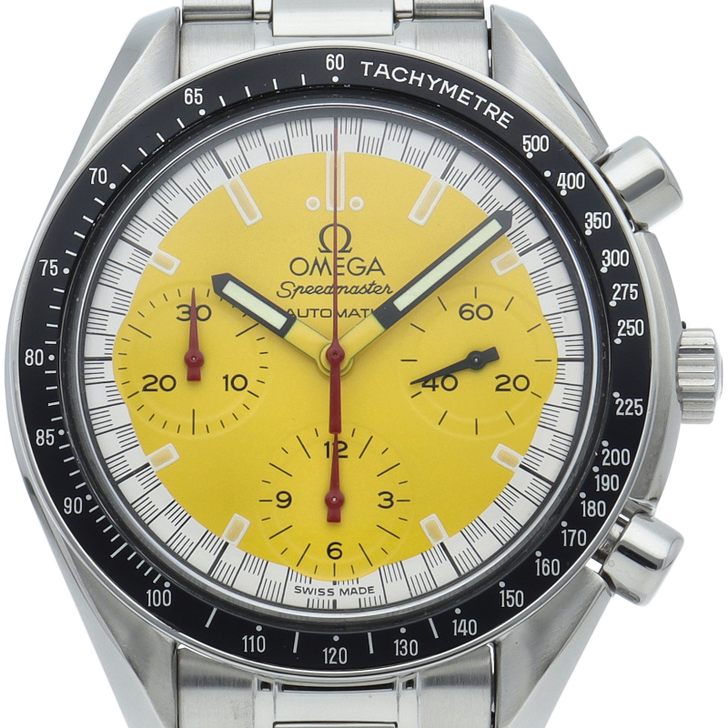 オメガでファンであったF1ドライバー、ミハエル・シューマッハと広告契約を結んだことを記念して製作されたモデル。文字盤の外周部はチェッカーフラッグをイメージしたデザインになっています。