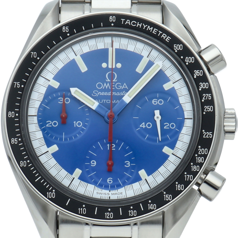 数々のF1チャンピオンに輝いたシューマッハとオメガのコラボレーション「スピードマスター」。シンプルな中にもひときわ目立つ文字盤の配色がオシャレな1本。