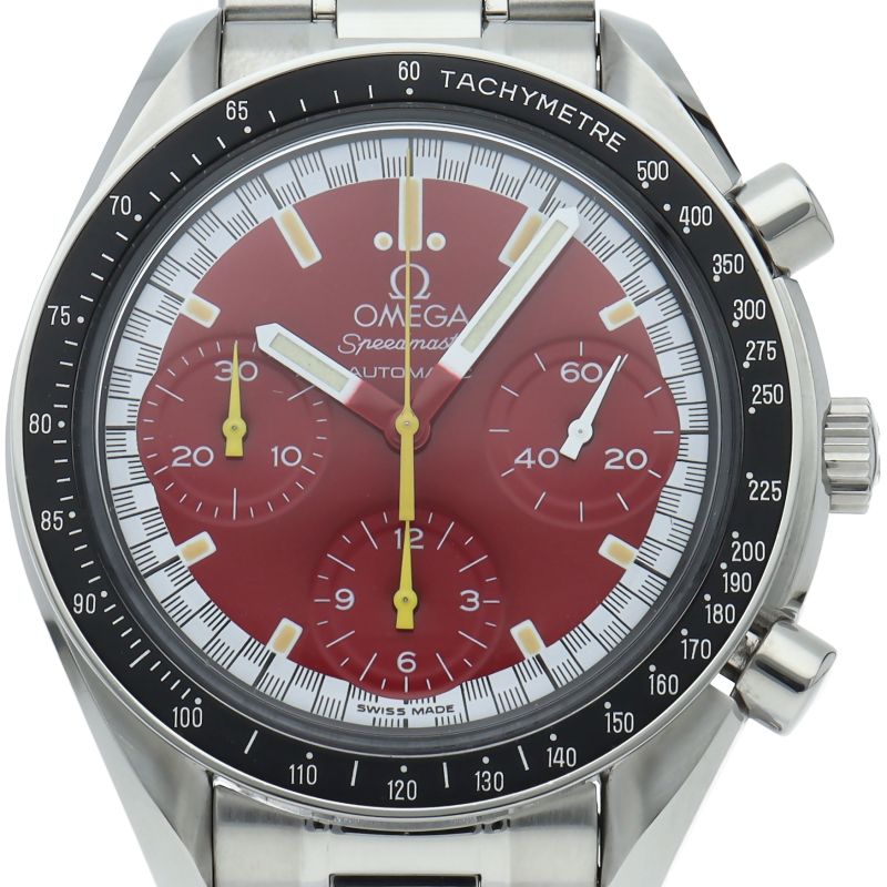 数々のF1チャンピオンに輝いたシューマッハとオメガのコラボレーション「スピードマスター」。シンプルな中にもひときわ目立つ文字盤の配色がオシャレな1本。