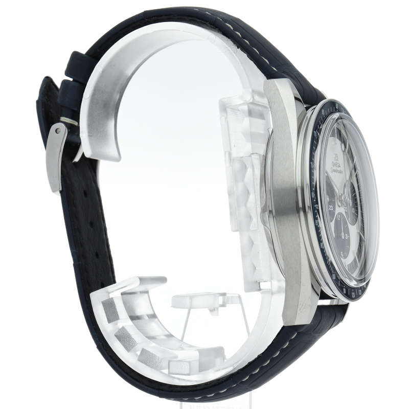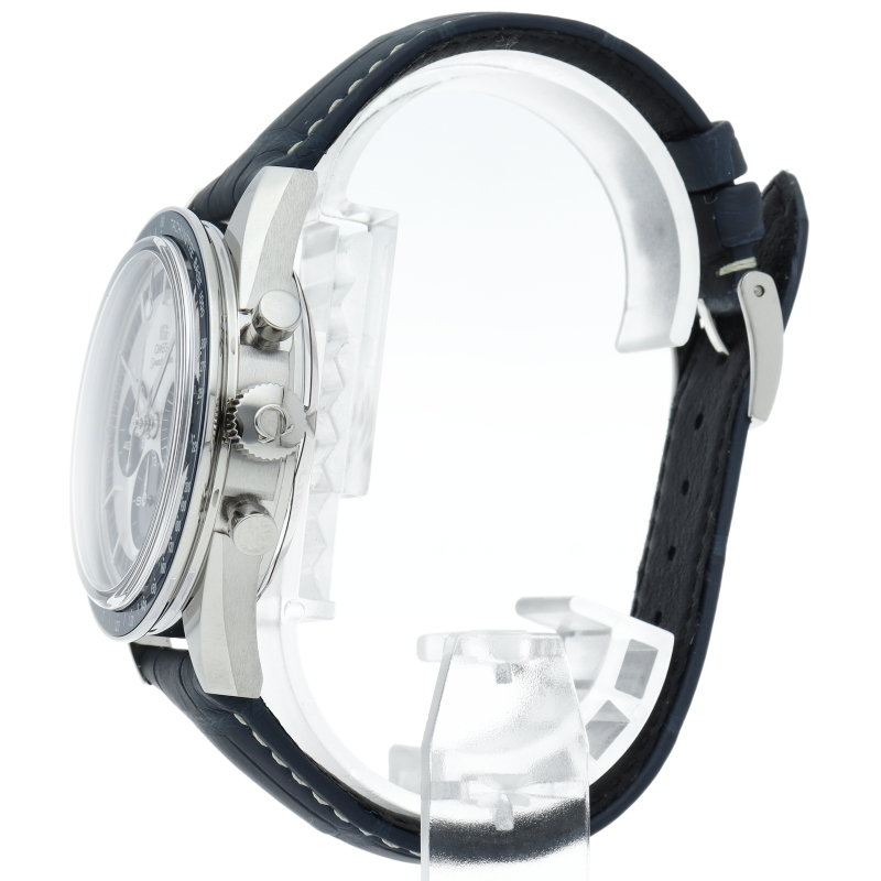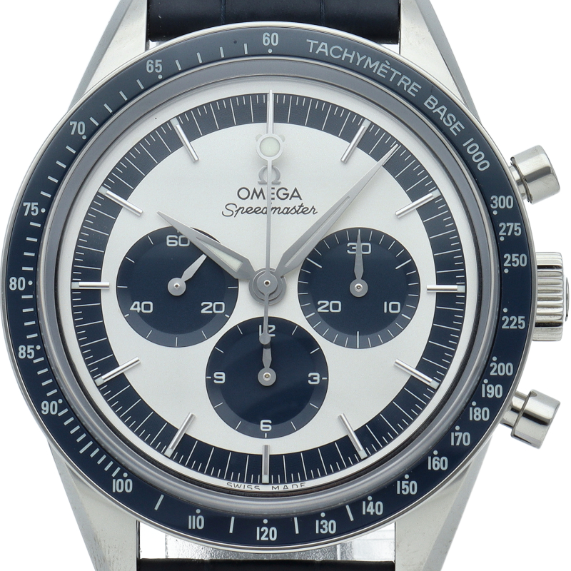 オメガを代表する人気シリーズ「スピードマスター」。タイムピースのステンレススティール製ケースには、ホワイトのスーパールミノヴァを塗布したタキメータースケールを備えるポリッシュ仕上げのブルーセラミック製ベゼルが調和します。ベージュのステッチが入ったブルーのレザーストラップ、そして自社製キャリバー1861が、タイムピースを完璧に仕上げています。