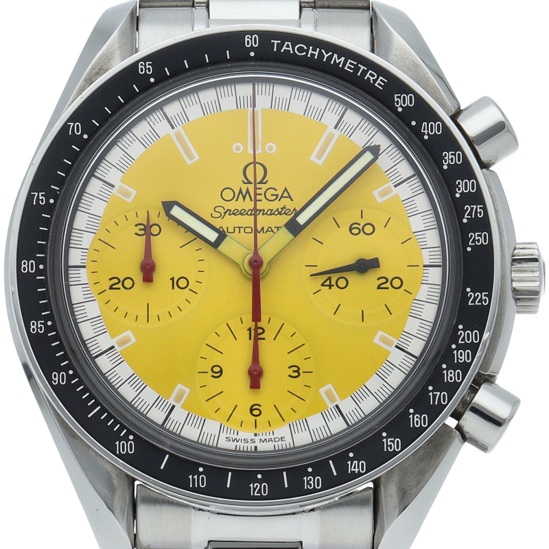 オメガでファンであったF1ドライバー、ミハエル・シューマッハと広告契約を結んだことを記念して製作されたモデル。文字盤の外周部はチェッカーフラッグをイメージしたデザインになっています。