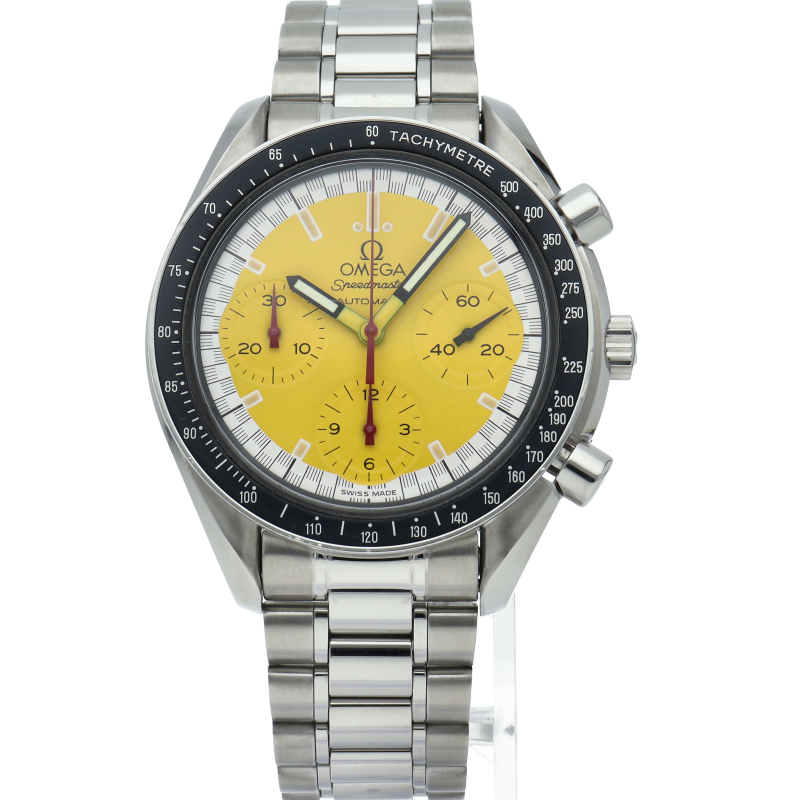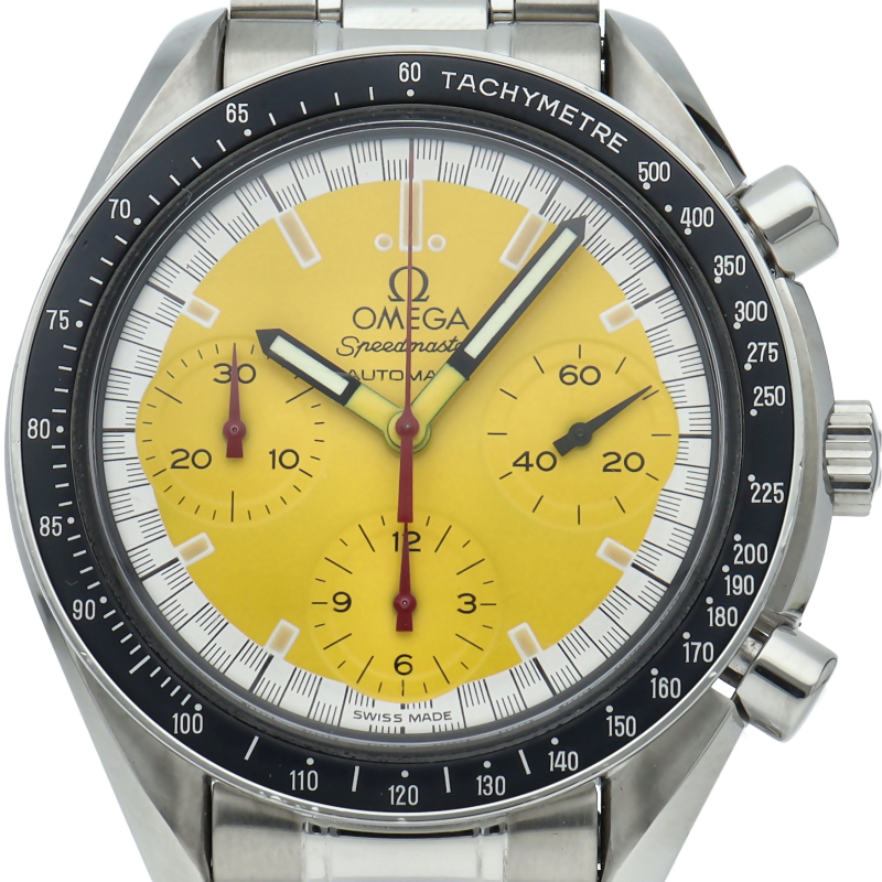 オメガでファンであったF1ドライバー、ミハエル・シューマッハと広告契約を結んだことを記念して製作されたモデル。文字盤の外周部はチェッカーフラッグをイメージしたデザインになっています。