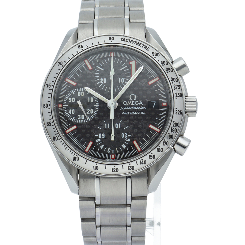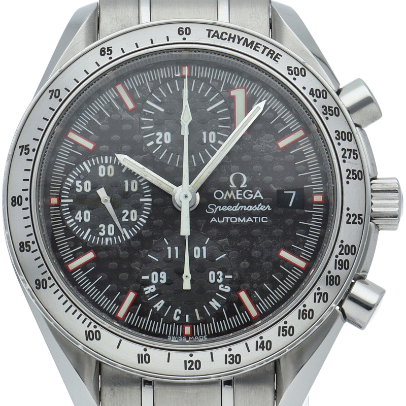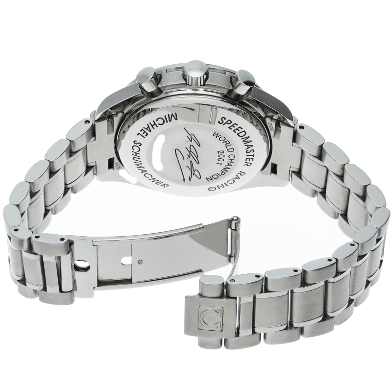 モータースポーツをイメージして設計された「スピードマスター レーシング」。伝説のドライバー、ミハエル・シューマッハが2001年ワールドチャンピオンになったのを記念に作られた世界限定11111本限定モデル。インデックスの1の数字と限定本数11111本という、「NO.1」にこだわり抜いた貴重な1本。