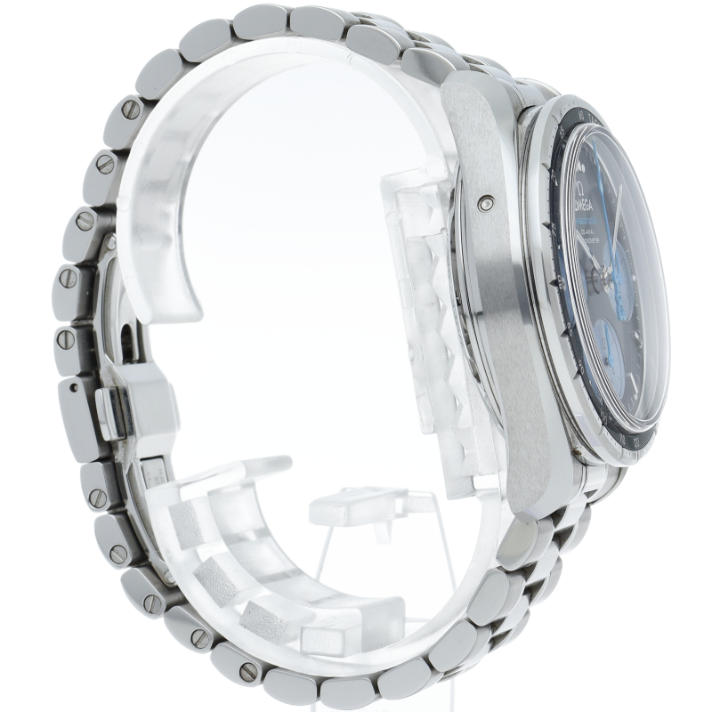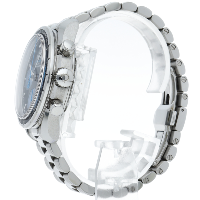 オービス・インターナショナルと「空飛ぶ眼科病院」が行っている活動を広めるためにデザインされた、スピードマスター38mm 。ステンレススティール製ケースと、ブルーのアルミニウム製リングにタキメータースケールを搭載したベゼルが特徴です。