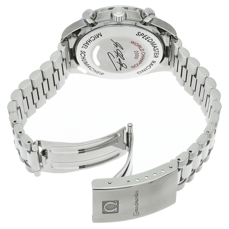 モータースポーツをイメージして設計された「スピードマスター レーシング」。ミハエル・シューマッハが2000年にF1ワールドチャンピオンになったのを記念したモデル。タキメーターの表示とシューマッハの刻印、オレンジとレッドカラーがよりレーシングモデルらしい雰囲気を演出しています。世界限定4000本。