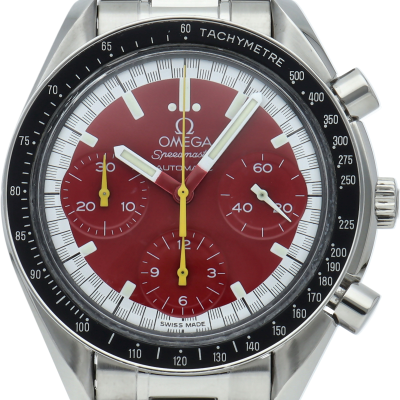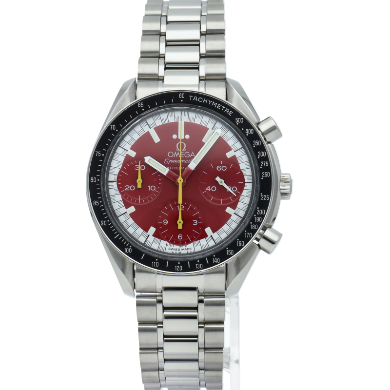 数々のF1チャンピオンに輝いたシューマッハとオメガのコラボレーション「スピードマスター」。シンプルな中にもひときわ目立つ文字盤の配色がオシャレな1本。