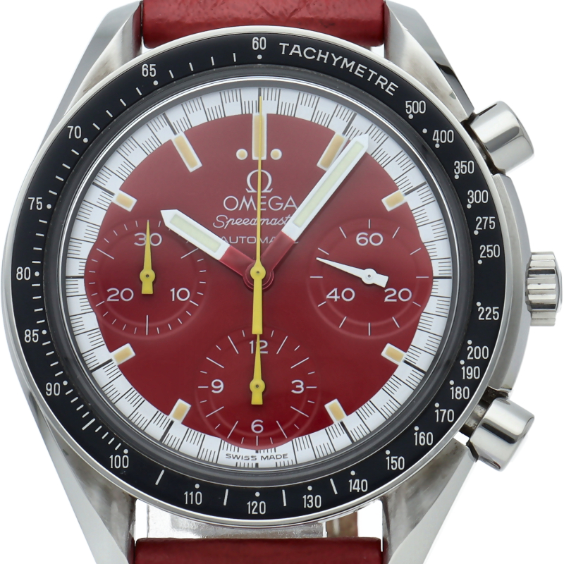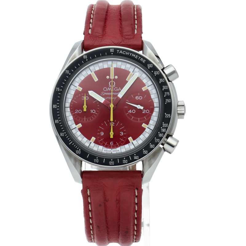 数々のF1チャンピオンに輝いたシューマッハとオメガのコラボレーション「スピードマスター」。シンプルな中にもひときわ目立つ文字盤の配色がオシャレな1本。