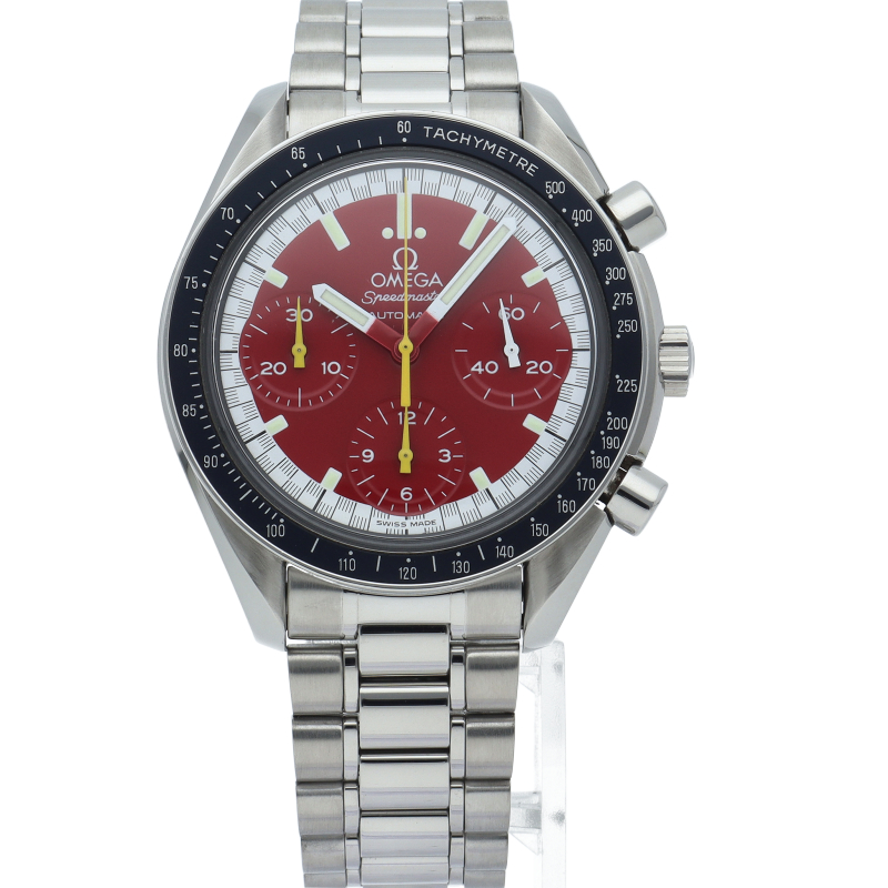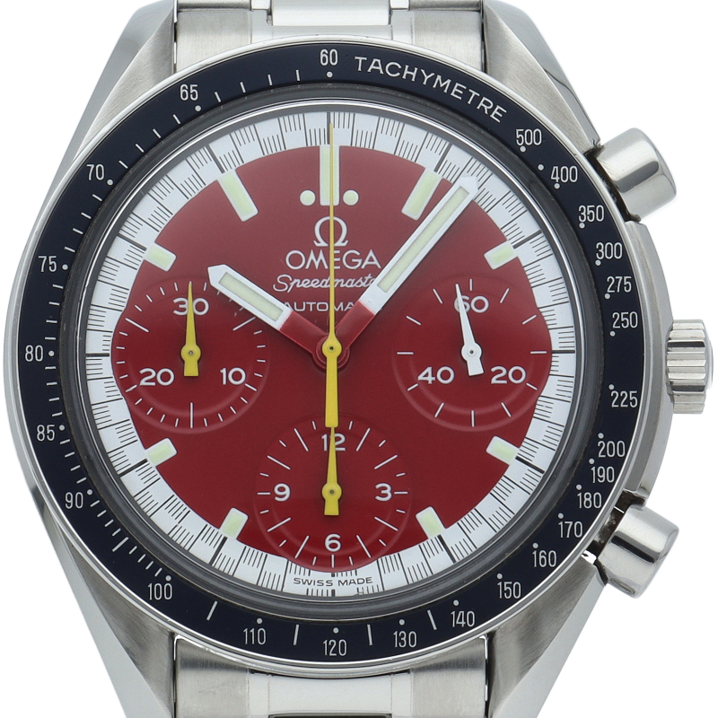 数々のF1チャンピオンに輝いたシューマッハとオメガのコラボレーション「スピードマスター」。シンプルな中にもひときわ目立つ文字盤の配色がオシャレな1本。