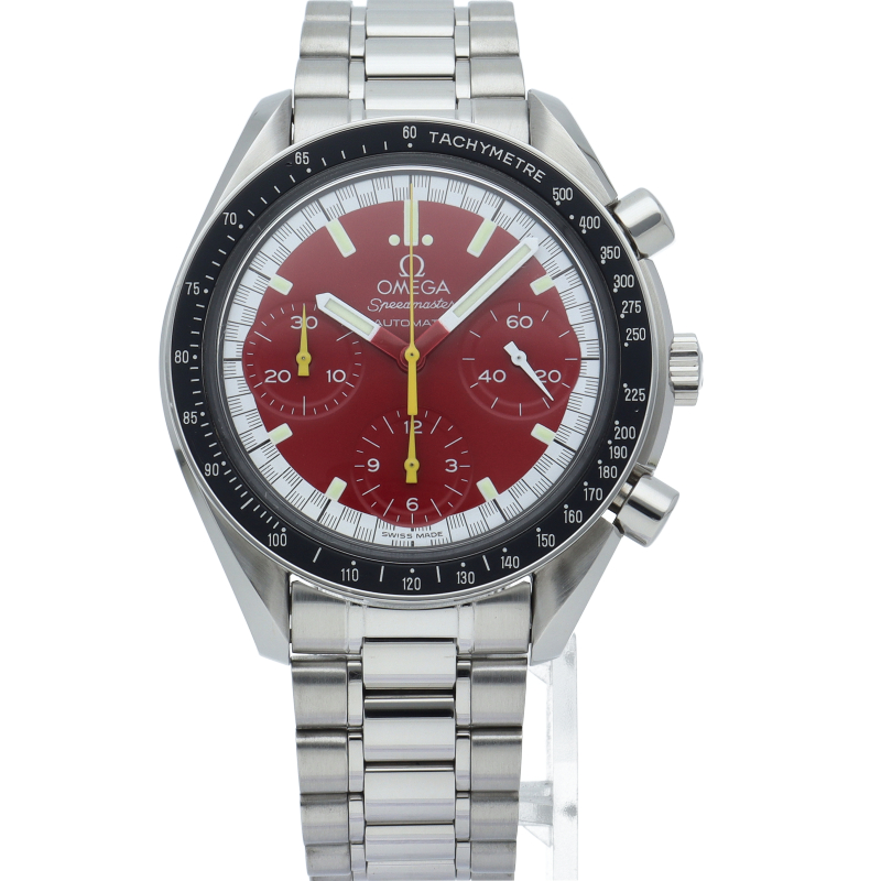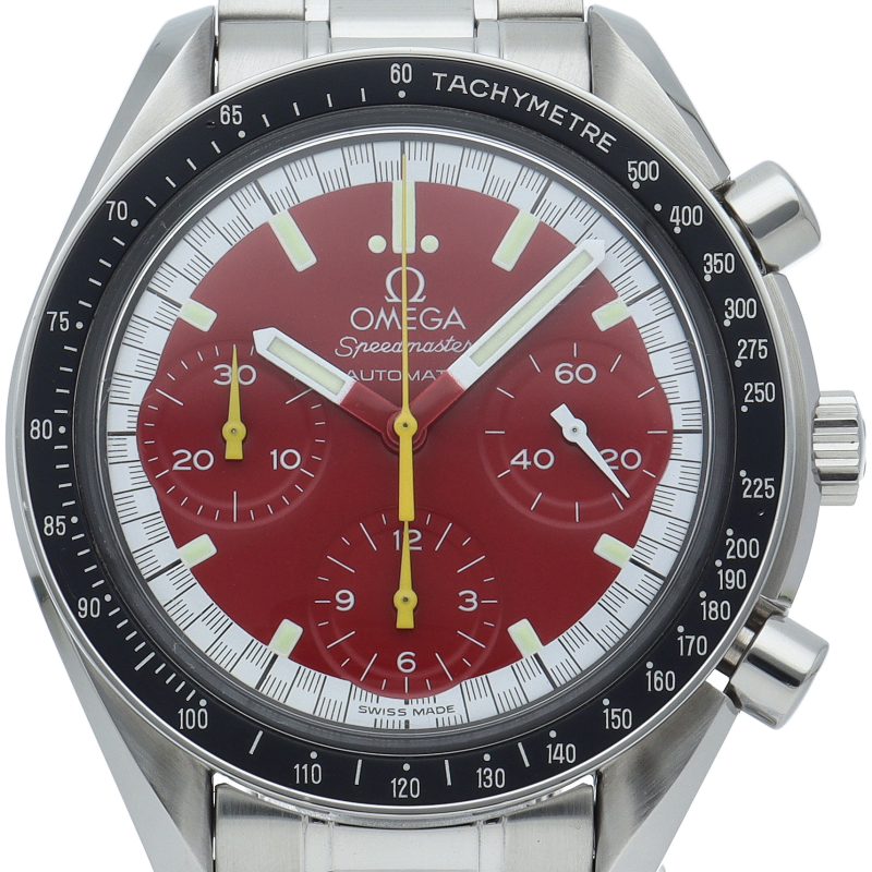 数々のF1チャンピオンに輝いたシューマッハとオメガのコラボレーション「スピードマスター」。シンプルな中にもひときわ目立つ文字盤の配色がオシャレな1本。