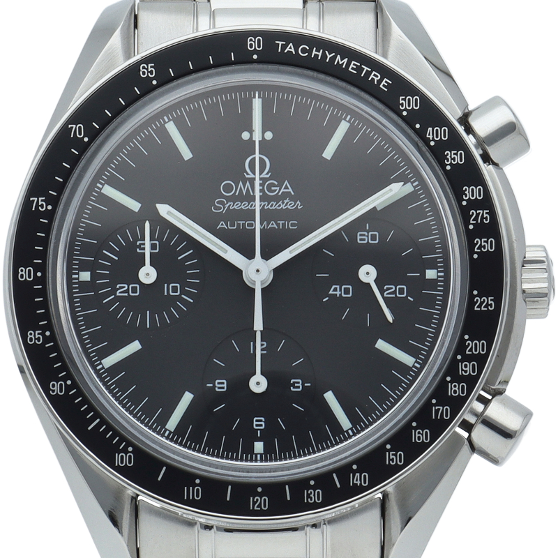 オメガを代表する人気シリーズ「スピードマスター」。プラ風防からサファイアクリスタル風防へ仕様変更された実用性の高いモデルです。すでに生産終了となり、これからの相場が楽しみな1本です。