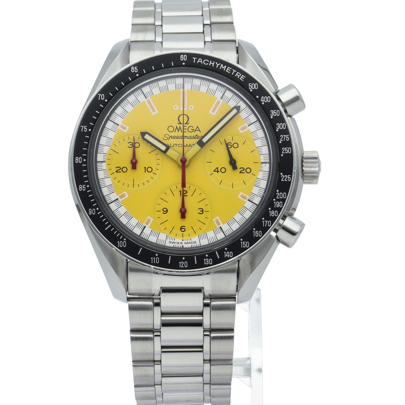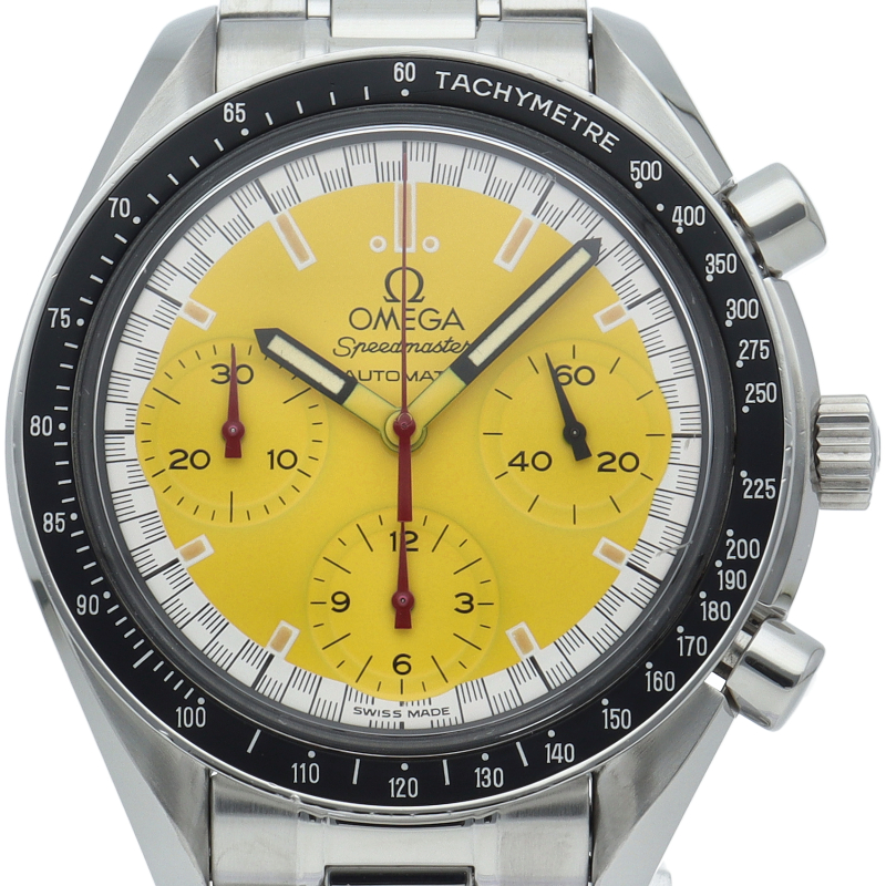 オメガでファンであったF1ドライバー、ミハエル・シューマッハと広告契約を結んだことを記念して製作されたモデル。文字盤の外周部はチェッカーフラッグをイメージしたデザインになっています。