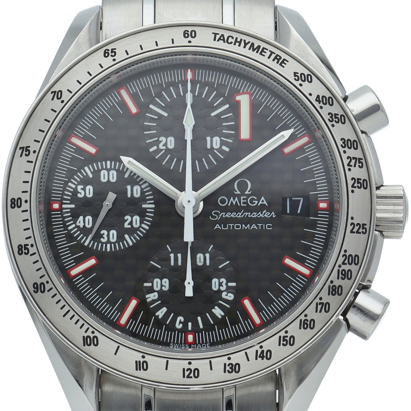 モータースポーツをイメージして設計された「スピードマスター レーシング」。伝説のドライバー、ミハエル・シューマッハが2001年ワールドチャンピオンになったのを記念に作られた世界限定11111本限定モデル。インデックスの1の数字と限定本数11111本という、「NO.1」にこだわり抜いた貴重な1本。