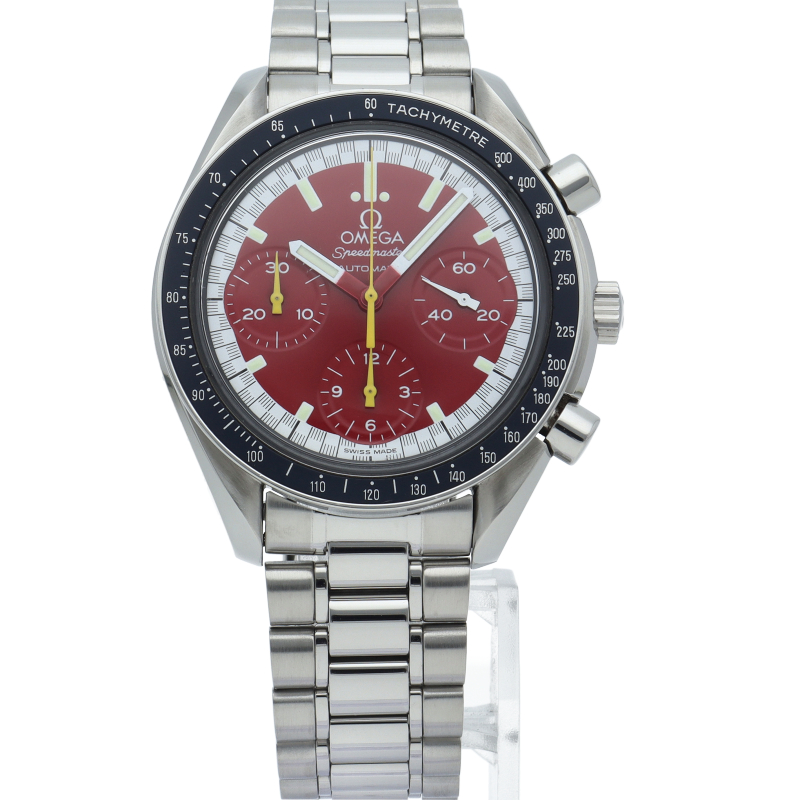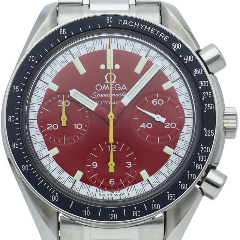 数々のF1チャンピオンに輝いたシューマッハとオメガのコラボレーション「スピードマスター」。シンプルな中にもひときわ目立つ文字盤の配色がオシャレな1本。