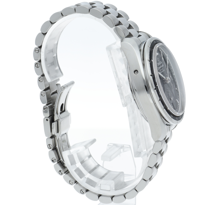 このモデルの特徴は、ステンレススティール製ケースと、ブラックのアルミニウム製リングにタキメータースケールを搭載したベゼルです。サンブラッシュ仕上げのグレーのダイアルには横楕円型のサブダイアルを、6時位置には縦楕円型の日付窓を配しました。針とインデックスはロジウム仕上げです。オメガ コーアクシャル キャリバー3330搭載。